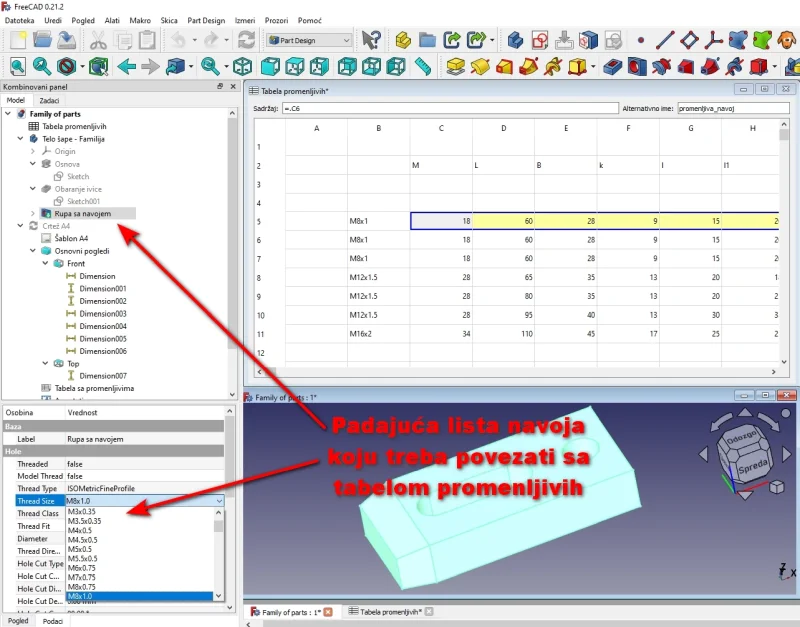 Proces spajanja padajuće liste i tabele se onda sam nameće. Ako pogledate tabelu promenljivih u mom 3D modelu, kolona C predstavlja redne brojeve navoja iz kolone B u listi navoja tipskog oblika Rupa. Opisno rečeno u ćeliji C5 brojka 18 označava poziciju navoja sitnog koraka M8x1 u padajućoj listi navoja, u ćeliji C8 brojka 28 označava poziciju navoja sitnog koraka M12x1.5... Kolona B ne predstavlja promenljive već samo vizuelno prikazuje imena navoja iz kolone C.