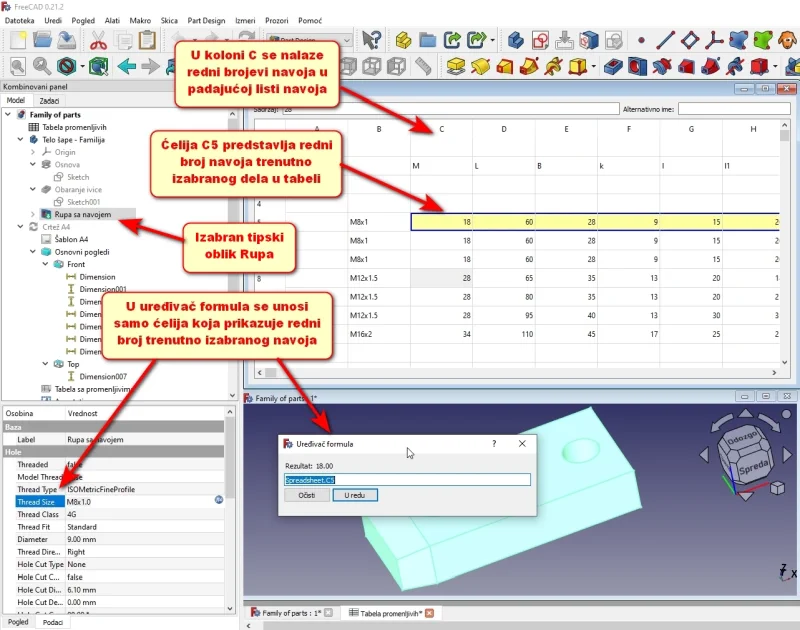 Kada se napravi konfiguraciona tabela (vidi tutorial), FreeCAD će u ćeliji C5 prikazivati trenutno aktuelnu vrednost iz kolone C. Upravo nam je ćelija C5 potrebna da bi smo tipskom obliku Rupa rekli koji navoj da upotrebi. Adresa ćelije C5 se unosi u tipski oblik Rupa preko opcije Veličina navoja (Thread size) u Urednika svojstava (Property editor). Kliknite desnim klikom na opciju Veličina navoja (Thread size), izaberite Uređivač formula (Expression) i unesite u njega izraz