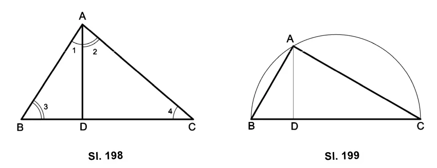 Prvu proporciju dobijamo iz sličnih trouglova ABD i ADC. Trouglovi su slični zato što ∢1=∢4 i ∢2=∢3, kao uglovi sa uzajamno normalnim kracima (§ 80). Uzmimo u △ABD strane BD i AD koje čine prvu razmeru tražene proporcije: odgovarajuće strane u △ADC biće AD i DC1) stoga BD:AD=AD:DC.