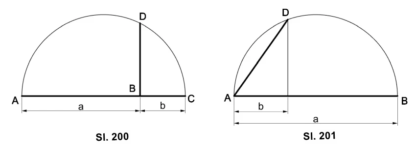 Na proizvoljnu pravu (sl. 201) prenosimo od tačke A duži a i b. Nad većom od ovih duži, kao nad prečnikom, opišimo polukrug, a iz krajnje tačke manje duži dignimo normalu prema AB do preseka s kružnom linijom u tački D i spojimo A i D. Tetiva AD biće srednja proporcionala između a i b.
