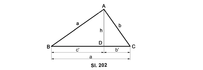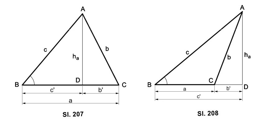 Obeležimo odsečke strane a (koja se ima produžiti ako je C tup ugao, sl. 208) ovako: odsečak BD, nalegli strani c, sa c', a odsečak DC, nalegli strani b, sa b'. Na osnovu teoreme o kvadratu strane naspram oštrog ugla (§ 194) možemo napisati: