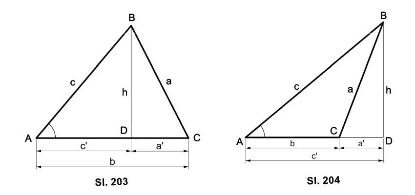 S druge strane, a'=b-c' (sl. 203) ili a'= c'-b (sl. 204). U oba slučaja za (a')2 dobijamo jedan isti izraz:
