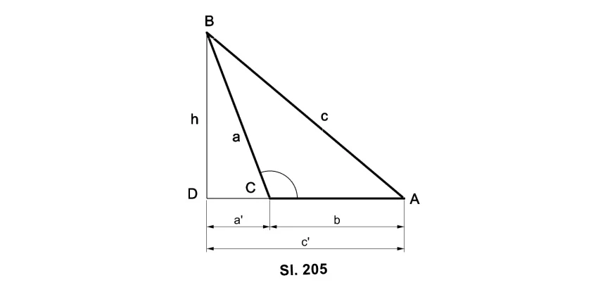 Neka u trouglu ABC (sl. 205) strana AB leži naspram tupog ugla C, a BD - visina spuštena na produženje koje bilo strane, na primer na AC; treba dokazati da