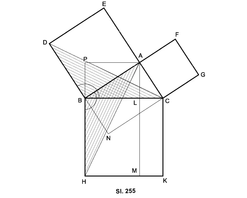 Euklidov dokaz. Neka je ABC (sl. 255) pravougli trougao, a BDEA, AFGC i BCKH - kvadrati konstruisani nad katetama i hipotenuzom; treba da se dokaže da je zbir površina prva dva kvadrata jednak površini trećeg kvadrata.