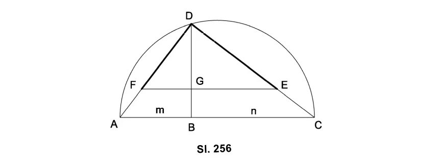 Na proizvoljnu pravu prenosimo (sl. 256) AB=m i BC=n, i nad AC, kao nad prečnikom, opišimo polukrug: Iz tačke B podignimo normalu BD do preseka sa polukrugom. Povucimo tetive AD i DC, dobijemo pravougli trougao kod koga je (§ 192):