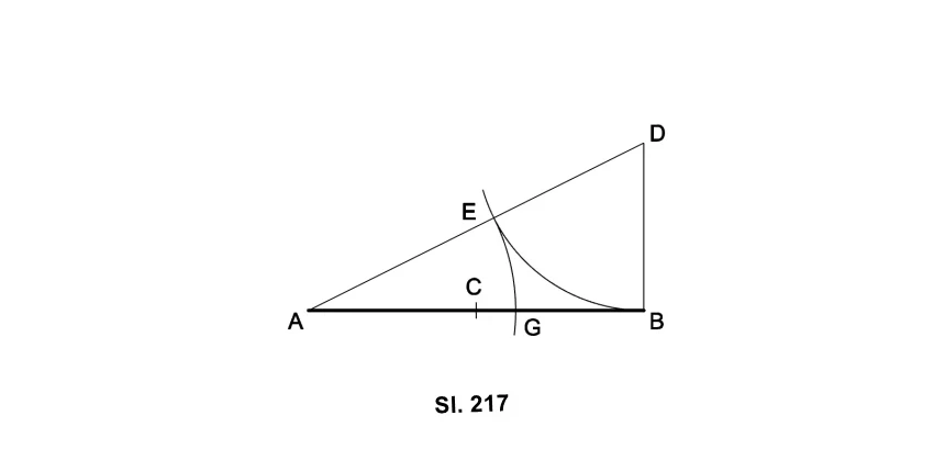 Delimo (sl. 217) datu duž AB=a na dva jednaka dela tačkom C. Iz tačke B podignimo normalu i prenesimo na nju BD=BC. Spajanjem tačaka A i D dobijamo pravougli trougao ABD čije su katete AB=a i BD=a/2. Stoga će njegova hipotenuza AD biti jednaka