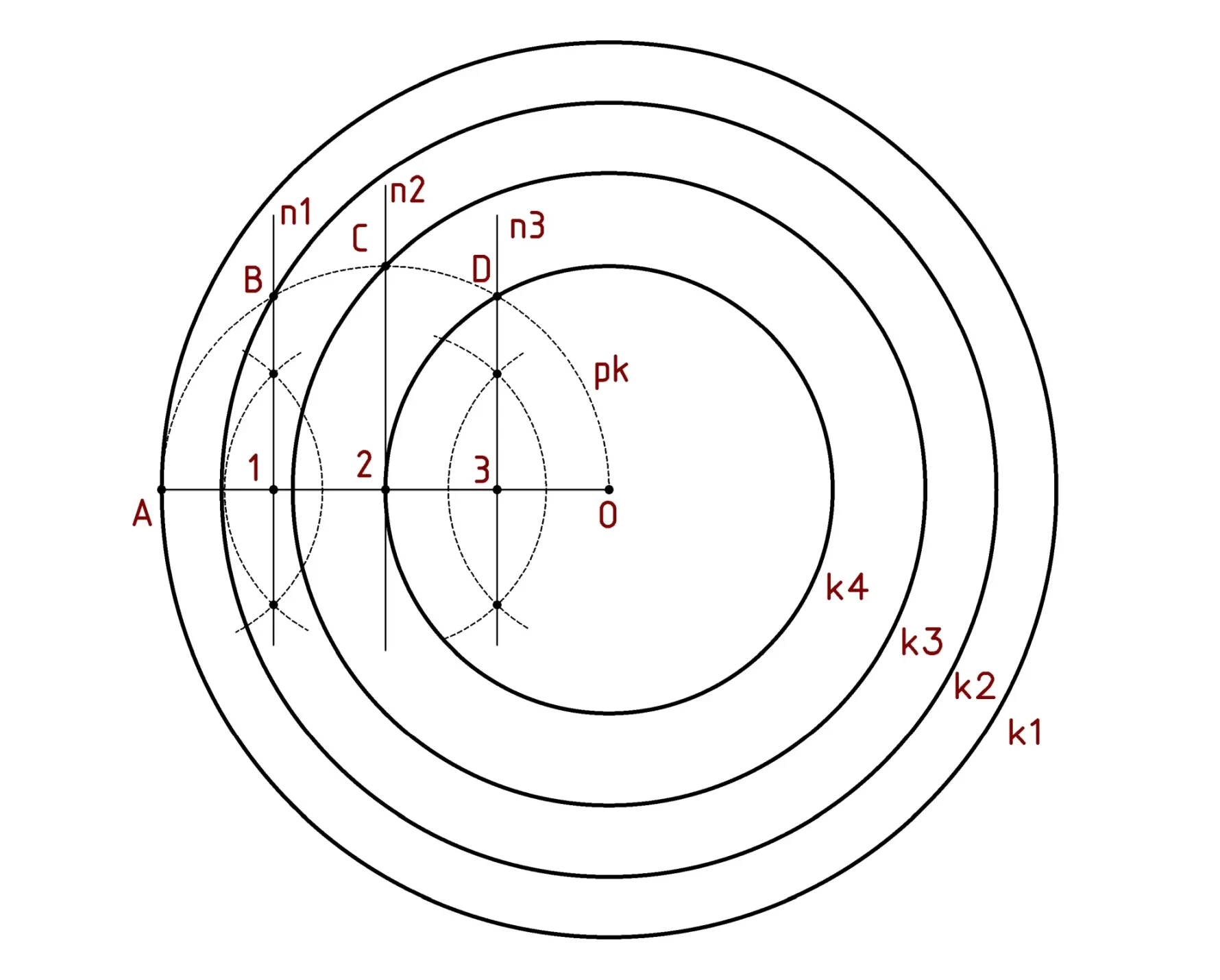 • Iz tačaka 1, 2 i 3 nacrtaj normale n1, n2 i n3 u odnosu na poluprečnik OA. Normale seku polukrug pk u tačkama B, C i D. Postupak crtanja normale možete videti na strani Konstrukcija normale na datu tačku prave.