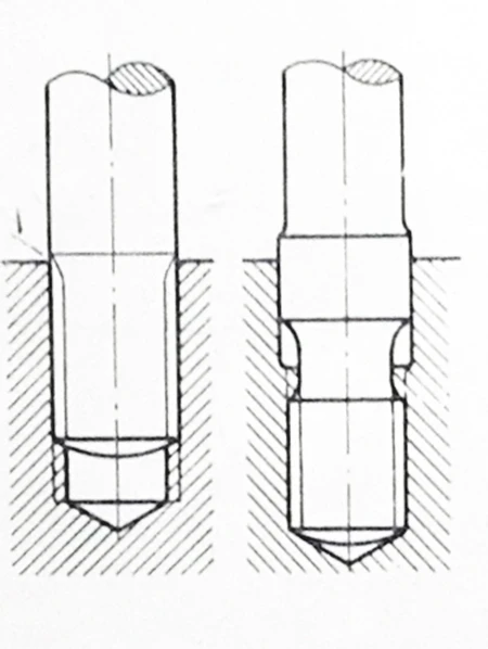 Jako zarezno delovanje postoji kod opterećenog zavrtnja i na mestu izlaza noža (A na sl. 24). Primenom konstrukcije predstavljene na desnoj strani ovo se mesto rasterećuje od vršnih naprezanja.