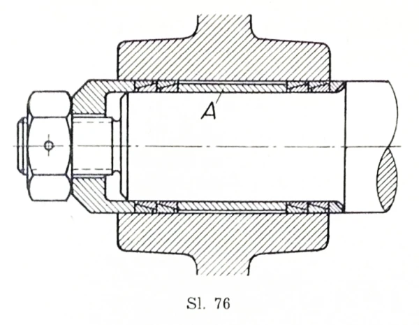 Prstenasti klinovi. Fabrika, Ringfeder, Krefeld već duže vremena i vrlo uspešno primjenjuje novi način međusobnog vezivanja delova, i to pomoću tzv. prstenastih klinova. Zbog očevidnih prednosti i vanredne jednostavnosti ovakvih veza, fabrika je patentirala prstenaste klinove kao novi mašinski elemenat. Ovaj novi klin se sastoji od dva tanka prstena sa međusobnom koničnom površinom naleganja, sl. 77. Spoljašnje površine su, međutim, cilindrične, što predstavlja značajnu prednost za obradu s obzirom na činjenicu da su tada kako samo vratilo tako i otvor u glavčini cilindrični. Postepenim pritezanjem prstenova nastaje elastično sabijanje unutrašnjeg prstena pri istovremenom širenju spoljašnjeg. U delovima veze javlja se stoga kružni napon, a posledica toga je ravnomerno pritezanje glavčine uz vratilo. Na ovaj način, bez obzira na neznatne preseke što ih imaju prstenovi, mogu se proizvesti vrlo velike radijalne sile, dakle i velike periferne sile trenja, pomoću kojih se mogu prenositi veliki torzioni momenti. Pri tom klinovi potpuno hermetično zatvaraju prostor između vratila i glavčine.