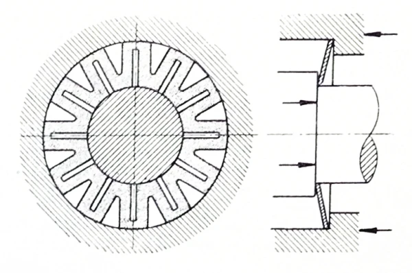 Vezivanje delova pomoću kružnog napona može se ostvariti i primenom prstenastih kružnih ploča izrađenih od kaljenog čelika za opruge, sl. 78. Koničan oblik same ploče i prorezi raspoređeni po njenom obimu na spoljašnjoj i unutrašnjoj strani omogućuju da se pri spajanju delova upotrebi neznatna sila, a da se pri tom postigne velik kružni napon koji će osigurati potrebni otpor protiv klizanja. U zavisnosti od veličine torzionog momenta koji se prenosi nameštaju se jedna, dve ili više prstenastih ploča jedna do druge. Ovaj način vezivanja delova ima naročitu prednost pri utvrđivanju predmeta sa tankim zidovima prilikom obrade na strugu. Pri utvrđivanju takvih predmeta na strugu primenom običnih sredstava, naponi se koncentrišu samo na nekoliko mesta predmeta, usled čega se on elastično deformiše te tako postaje necilindričan. Primenom prstenastih ploča predmet se ne deformiše, jer se kružni napon ravnomerno rasporedi po obimu, tako da se pri obradi takvih predmeta može postići i najveći mogući stepen tačnosti. U novim konstrukcijama spojnica, prstenaste ploče se primjenjuju u svojstvu elementa za uključivanje, pošto pri tom prigušuju udare obrtnih momenata.
