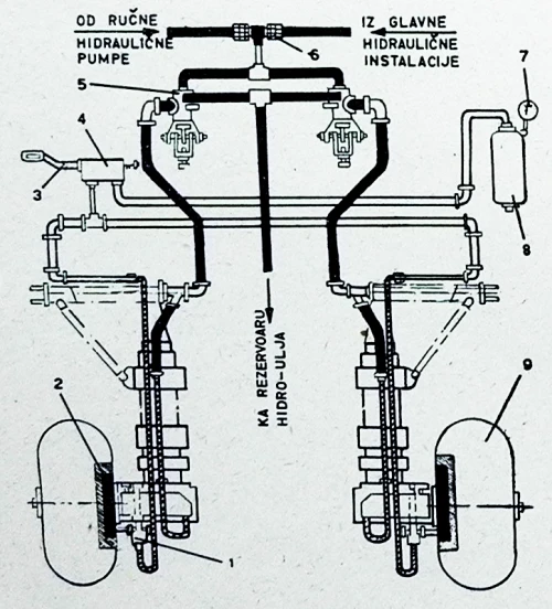 (1 - reduktor pritiska; 2 - kočnica; 3 - ručica razvodnika sabijenog vazduha; 4 - razvodnik sabijenog vazduha; 5 - nožne hidraulične pumpe; 6 - nероvratni hidraulični ventil; 7 - manometar sabijenog vazduha; 8 - rezervoar sabijenog vazduha; 9 - avionski točak)