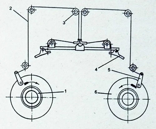(1 - kočnica; 2 - čelično uže; 3 - koturovi; 4 – nožne pedale komande pravca; 5 - poluga kočnice; 6 - avionski točak)
