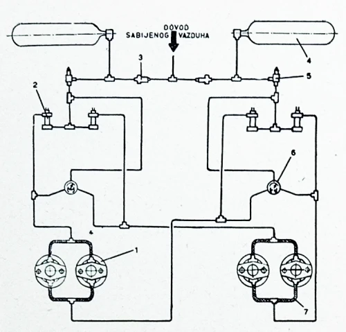 (1 - kočnica; 2 - nožne pumpe; 3 – nepovratni ventil; 4 - rezervoar sabijenog vazduha; 5 - -reducir ventil; 6 - manometar; 7 - gipko crevo)