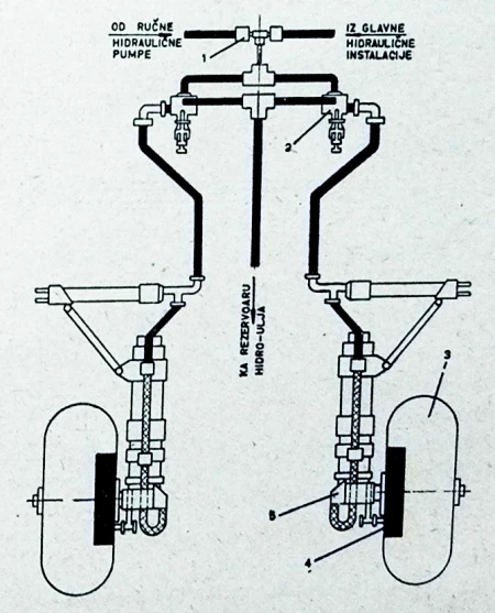 (1 - nepovratni ventil; 2 - nožna hidraulična pumpa; 3 - avionski točak; 4 - kočnica; 5 - reduktor pritiska hidro-ulja)