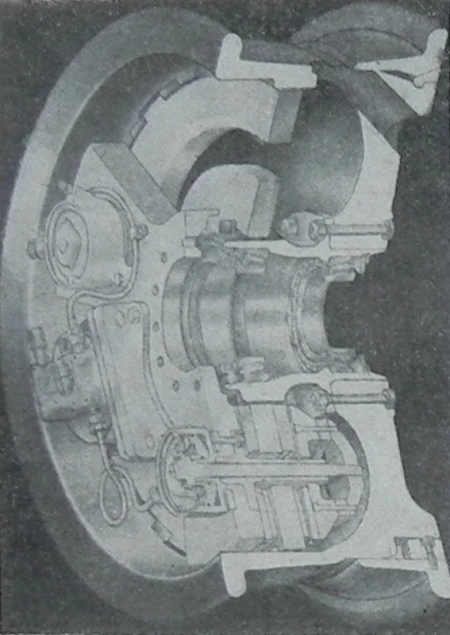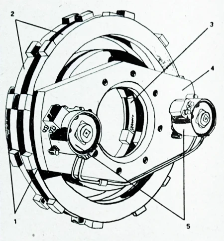 (1 - ulošci od frikcionog materijala; 2 - pokretni diskovi; 3 - nepokretni diskovi čvrsto spojeni sa osovinom točka; 4 - ploča kočnice sa radnim cilindrima; 5 - radni cilindri kočnice)