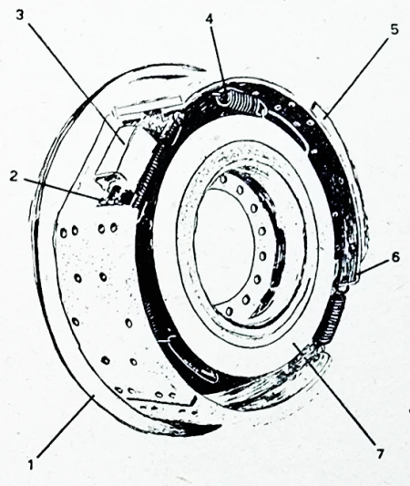 (1 - prahobran; 2 - točkić za podešavanje zazora; 3 - kompenzator habanja; 4 - opruga za vraćanje elektromagneta; 5 - segmenti od frikcionog materijala; 6 - čelična papuča; 7 - elektromagnet)