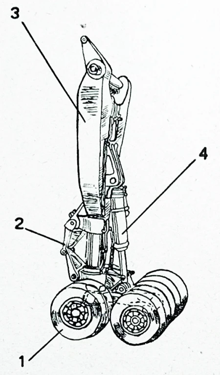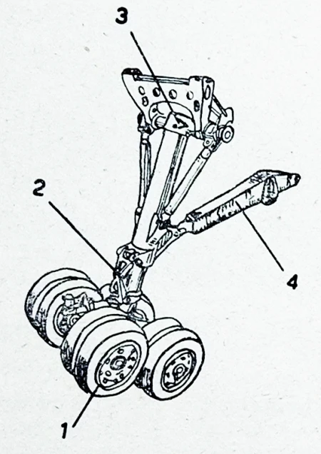 (1- avionski točkovi sa kočnicama; 2- torziono ukrućenje; 3 - elastična noga; 4 - upornica)