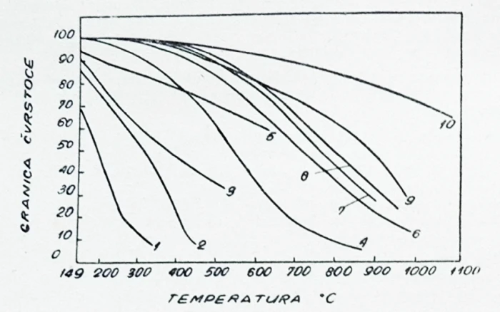 Karakteristike postojećih legura prikazane su na slici 5. Na grafikonu su nanesene zavisnosti relativne granice čvrstoće na istezanje (u odnosu na granicu čvrstoće na sobnoj temperaturi) od temperature. Po svojoj suštini granica čvrstoće na istezanje ima istu vrednost kao i granica puzanja pri vrlo kratkom vremenu dejstva. Sa izvesnim izuzecima, grafikoni potvrđuju pretpostavku o povećanju granice puzanja pri povišenju temperature topljenja osnovnog metala legure.