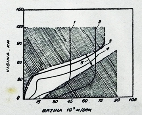 1- ulaz rakete u atmosferu sa početnom brzinom približno 4,6 km/sek; 2 - ulaz rakete u atmosferu sa početnom brzinom oko 7 km/sek; 3 - putanja veštačkog zemljinog satelita; 4 - putanja rakete koja planira; 5 - zona mogućih dužih letova.
