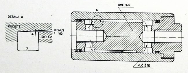 Tako, na primer, ako ugao nagiba konusa umetka i kućišta pre čistača iznosi 1:100, onda će se pri horizontalnom pomeranju umetka za x = 1mm dobiti sledeće suženje procepa: