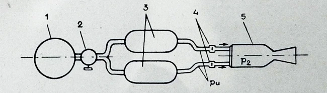 1 - akumulator pritiska neutralnog gasa, 2 - reduktor pritiska neutralnog gasa, 3 - rezervoari goriva i oksidatora, 4 - membrane, 5 - raketni motor; p2 - pritisak u komori sagorevanja; Pu - pritisak goriva i oksidatora u instalaciji