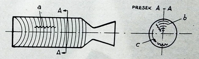 a) longitudinalni; b) radijalni; c) tangencijalni
