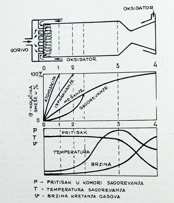Slika 2 - Odvijanje procesa u komori sagorevanja od momenta ubrizgavanja goriva i oksidatora do završne transformacije i isticanja sagorelih gasova