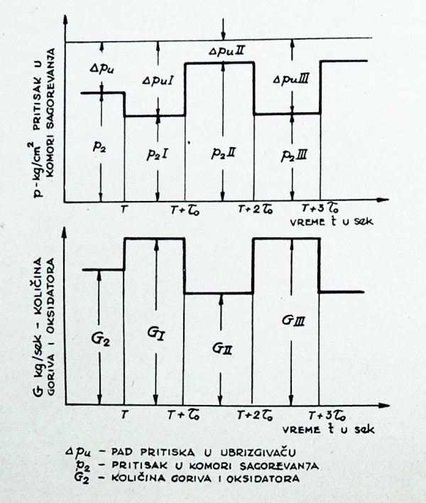 Kao što se iz ove formule vidi, povećanje pada pritiska kroz ubrizgač Δpu, dovodi do povećanja protoka goriva i oksidatora, da bi docnije došlo i do povećanja pritiska u komori sagorevanja. Razume se da do tog povećanja ne dolazi naglo i odmah, već posle vremena zakašnjenja »τ0«, kada iz tečnog goriva i oksidatora koji dotiču u većim količinama, počinje da se stvara odgovarajuća veća zapreminska količina produkata sagorevanja. Iz toga sledi da pritisak u komori raste samo posle »τ0«, tj. u trenutku T+τ0 (vidi sliku 9).