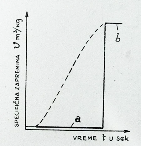 Za dalju analizu i da bismo jasnije shvatili razmatranje ovog problema, usvajamo da se specifična zapremina smeše tečnog goriva i oksidatora menja u toku procesa do specifične zapremine produkata sagorevanja po pravoj liniji, kao što se vidi na slici 7. Na taj način uslovno prihvatamo da se sagorevanje vrši trenutno, ali samo posle vremenskog perioda, tj. vremena zakašnjenja »τ0«. Pored toga, pretpostavljamo da se pritisak goriva i oksidatora na ulazu u komoru sagorevanja, tj. na ulazu u ubrizgač »pu« (pritisak u instalaciji) drži strogo konstantnim.