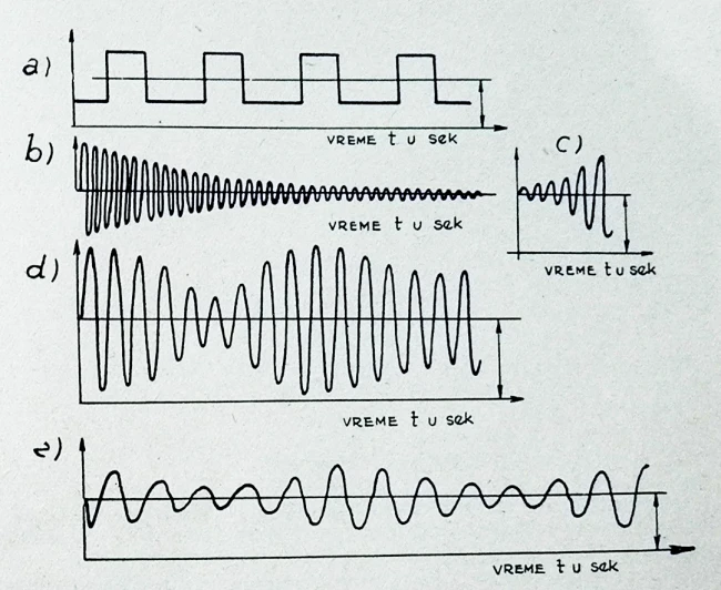 a) periodične oscilacije sa konstantnom amplitudom i frekvencom; b) prigušene oscilacije; c) oscilogram rastućih oscilacija; d) oscilacije sa naizmeničnim smanjenjem i povećanjem amplituda; e) oscilogram složenih proizvoljnih oscilacija