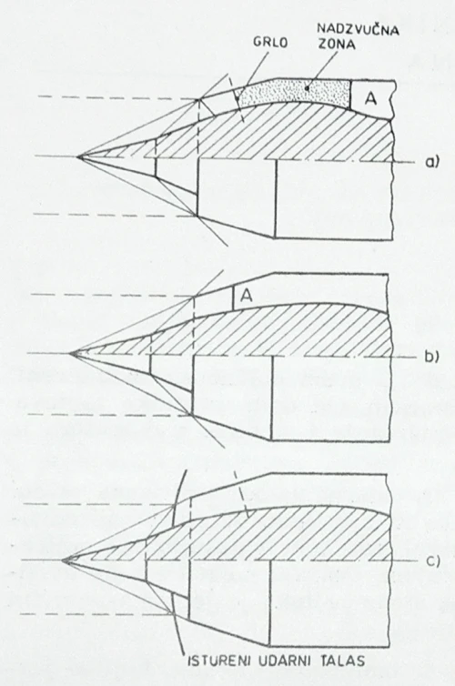Pri brzinama leta manjim od proračunske, kosi udarni talasi ne dodiruju usne uvodnika (slika 2). Uglovi talasa rastu, što dovodi do smanjenja protoka vazduha kroz uvodnik i do povećanja talasnih otpora. Da bi se i na ovim režimima leta izbegla pojava stvaranja isturenog udarnog talasa i obezbedio stabilan rad motora, potrebno je vršiti pomeranje pokretnog konusa, odnosno primeniti regulisani nadzvučni uvodnik vazduha.