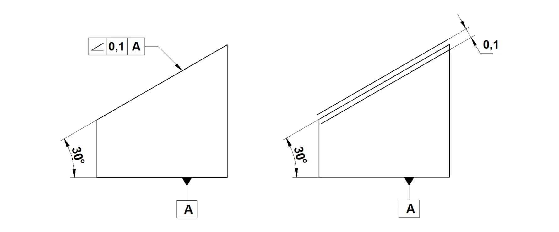 Drugim rečima zona tolerancije je prostor između dve idealno ravne i paralelne površine čiji razmak je definisan vrednosšću tolerancije a ove dve površine su pod nagibom u odnosu na referentnu površinu koji je zadat kotnim broje. Zona tolerancije može biti između dve paralelne linije ili ravni u tom slučaju rastojanje među njima je vrednost tolerancije, a takođe i unutar cilindra i u tom slučaju vrednost tolerancije definiše prečnik cilindra.